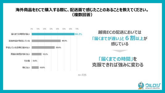 ■越境ECのボトルネックである「配送時間」を解決できれば強みに変わる「海外商品をECで購入する際に、配送面で感じたことのあることを教えてください。(複数回答)」と質問したところ、「届くまでの時間が長い」が66.2%、と6