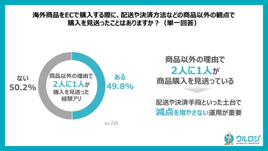 ■海外商品の購入に商品以外の理由で約半数が購入を見送っている「海外商品をECで購入する際に、配送や決済方法などの商品以外の観点で購入を見送ったことはありますか?(単一回答)」と質問したところ、「ある」が49.8%、「ない」が50.2%と