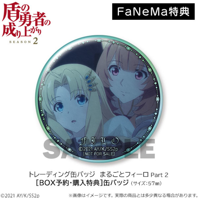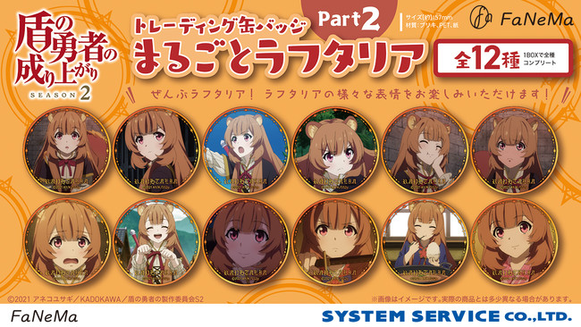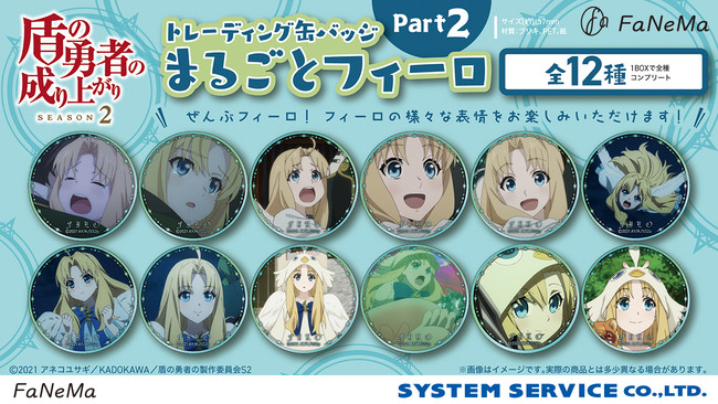 システムサービス株式会社(本社:東京都豊島区、代表取締役社長:田村宗弘)は、アニメ・マンガ・ゲーム作品等のキャラクター商品の企画・製作・販売をする自社ECサイト「FaNeMa」(URL:https://fanema.jp/)にて、アニメ『盾の勇者の成り上がり Season 2』より「トレーディング缶バッジ」2種を発売いたします。