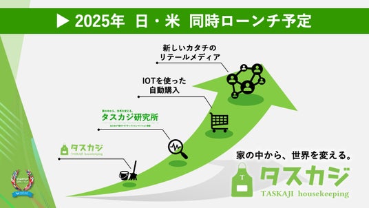 そこでタスカジは、IoTデバイスで家の中の在庫品をセンシングし、在庫が少なくなり次第最適なタイミングで自動購入する新サービスを開発し、2024年9月からは大手ドラッグストアと一緒に実証実験を開始予定、2025年に日米でサービス開始予定としています。