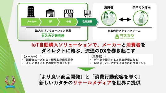 ■ タスカジのピッチ内容について この度、タスカジは法人向け事業の“家のナカ”オープンイノベーションを実施する「タスカジ研究所」の新規事業として、2025年からリリース予定の「自動購入サービス」についてお話しました。