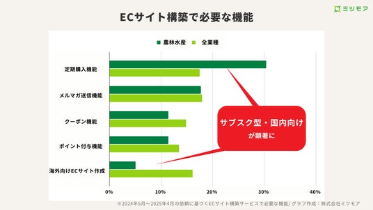 農林水産業の事業者がECサイト構築時に求める機能としては、「定期購入機能」が30.4%を占め、全業種平均の17.5%と比較して大きく上回っています。この調査データから、鮮度や季節性が重要な農林水産商材において、消費者に繰り返し購入してもらうことで安定的な収益を図る狙いがあると考えられます。