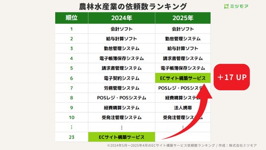 さらに、農林水産業における全カテゴリ中の依頼数順位も前年の23位から6位へと17ランクも順位を上げており、業界全体の中で存在感を大きく高めています。