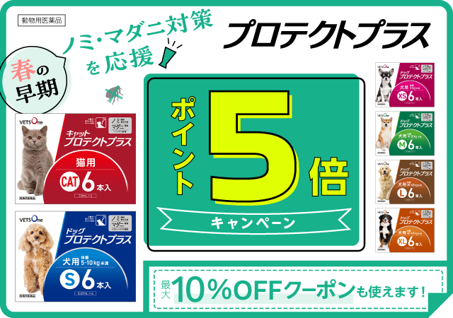 キャンペーン概要期間中、ドッグプロテクトプラスまたはキャットプロテクトプラスが全品ポイント5倍でお買い求めいただけます。