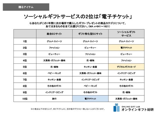 3.ギフト特化型ECサイトは総合的なカテゴリが並ぶ一方で、10位に「電子チケット」が入る結果となり、総合ECサイトとソーシャルギフトサービスの両方の特徴を融合させたような調査結果となりました。