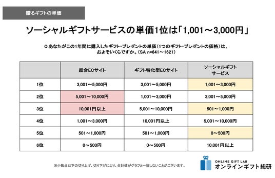 ソーシャルギフトサービスは1位「1,001~3,000円」、3位「501~1,000円」、5位「0~500円」となり、他の購入場所に比べて気軽なギフトを贈るサービスとして支持されていることが単価の面からも明らかになりました。