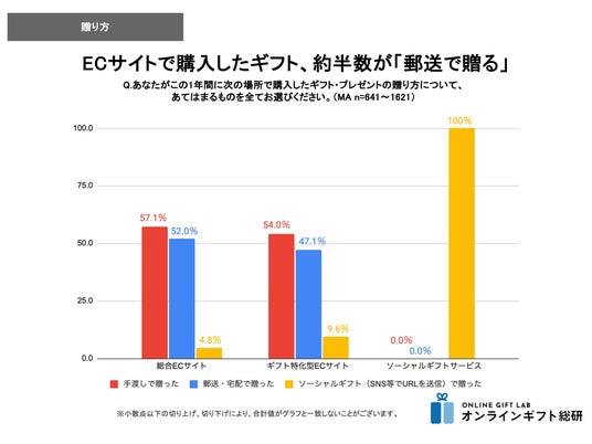 ■調査結果1.【贈り方】総合ECサイト・ギフト特化型ECサイトで購入したギフトのうち、約半数は「郵送」で贈られているオンラインのギフト購入場所の「総合ECサイト」・「ギフト特化型ECサイト」・「ソーシャルギフトサービス」の3つのチャネルごとにギフトの贈り方・アイテム・シーン・相手・ギフトの単価の調査を行いました。結果を比較することで、各購入場所の特徴や傾向がわかりました。