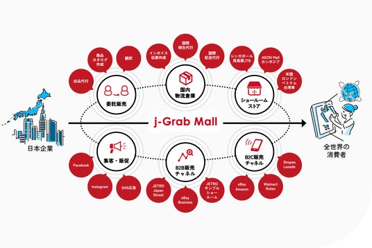日本の優れた商品やサービスを越境ECを通じて世界中のお客様に届けるため、eBay、Walmart、Amazonなど世界30を超える海外主要ECモールに販売できる越境ECプラットフォーム『 j-Grab Mall』の運営をはじめ、ECサイトや世界主要ECモールへの出店支援をワンストップ・伴走型で支援しています。