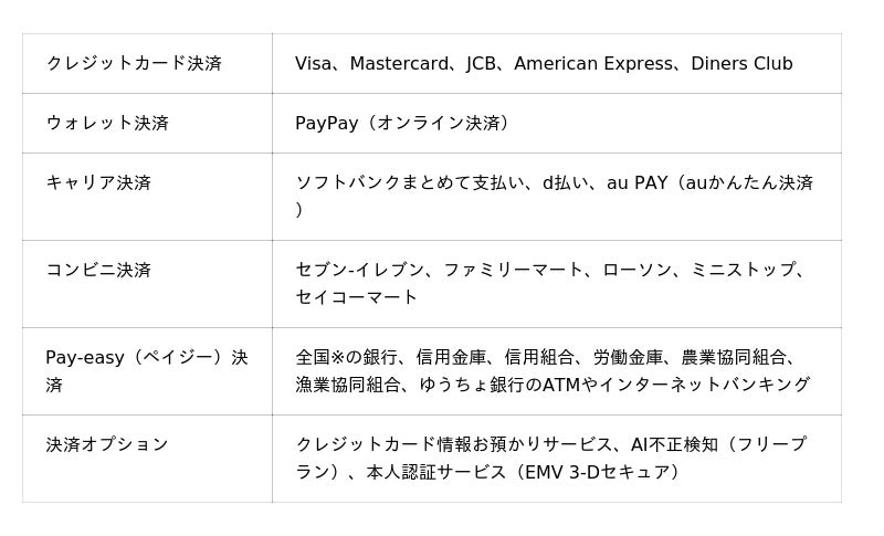 主要決済をまとめて導入(SBPS)SBPSは、ECサイト向けに最適化された決済環境を提供します。クレジットカード決済(Visa、Mastercard、JCBなど)はもちろん、PayPay(オンライン決済)やキャリア決済、コンビニ決済など、日本の消費者が求める主要なローカル決済を、開発工数をかけずに一括で導入することが可能です。また、AIを活用した不正検知サービスなどの高度なセキュリティ対策も備えており、スピーディーかつ安全に、信頼性の高い決済環境を整えることができます。