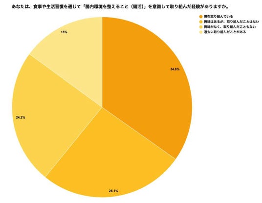腸活について、「現在取り組んでいる」「過去に取り組んだことがある」と回答した人は約60%(図1)。