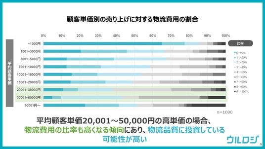 平均顧客単価が20,001円~50,000円の高単価の場合、物流費用の比率も高くなる傾向が見られます。高単価の商品を扱うEC事業者は、顧客満足度を高めるために、物流品質に投資している可能性が高いと考えられます。