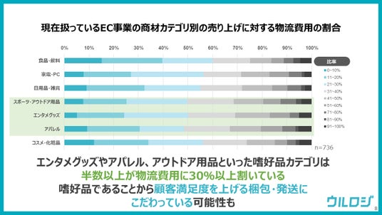 顧客満足度を高めるために、丁寧な梱包や迅速な配送サービスを提供していることが考えられます。そのため、梱包材や配送コストに費用をかけている可能性があります。アパレルは、返品率が高い商材であるため、返品に伴う物流コストが発生しやすいと考えられます。同様にアウトドア用品は、大型商品や重量のある商品が多いため、配送コストが高くなる傾向があります。