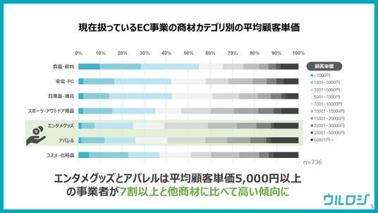平均顧客単価が5,000円以上の事業者が7割以上を占めており、他の商材カテゴリに比べて高単価な傾向が見られます。エンタメグッズは、限定商品やコレクターアイテムなど、希少価値の高い商品が多く、ファン心理をくすぐる価格設定がしやすいと考えられます。アパレルは、ブランドイメージやデザイン性によって高付加価値化しやすく、高価格帯でも需要が見込める商材と言えます。