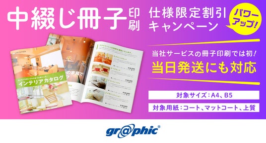 株式会社グラフィック(本社:京都市伏見区、代表取締役社長:西野能央、以下「当社」)はネット印刷事業にて、ご提供中の中綴じ冊子印刷〈仕様限定〉割引キャンペーンに「当日納期」を追加いたしました。午前10時までの注文と入稿(完全データ)を完了することで、注文当日に当社から出荷いたします。関東圏なら最短で翌日にお手元に商品が届きます。