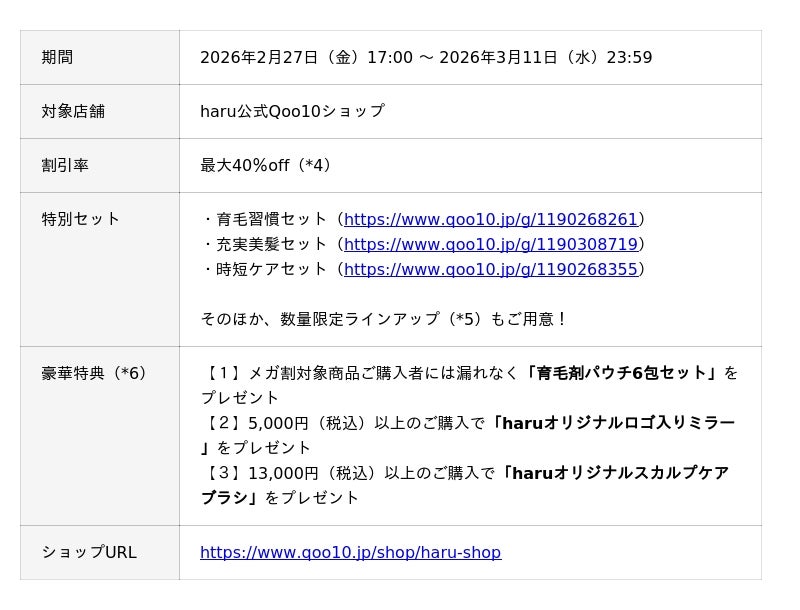 今回のQoo10「メガ割」でも、ご利用いただく多くのお客様に、そうした考え方に触れていただく機会として、最大40%OFF(*3)の特別価格に加え、Qoo10限定の特別セットをご用意しました。春の訪れとともに、地肌から整えるケアを通じて、美しく健やかな髪で毎日を心地よくお過ごしいただければ幸いです。