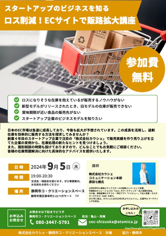 株式会社カウシェ(本社:東京都渋谷区、代表取締役:門奈剣平、以下カウシェ)は、自社で事業者の過剰在庫等を買い取り、お買い物アプリ「カウシェ」上で販売する買取・販売事業を拡大することで、事業者の廃棄ロス削減を目指しています。地域事業者からの買取強化を目的として、2024年9月5日に静岡市の協力のもと、静岡市の地域事業者向けのイベントを静岡市「コ・クリエーションスペース」にて、主に地域に根ざした事業者をターゲットとしたイベントを開催いたします。
