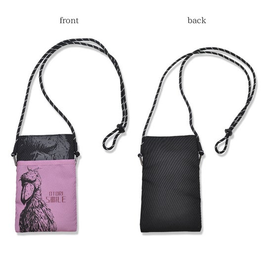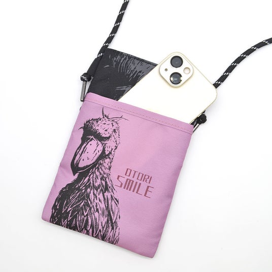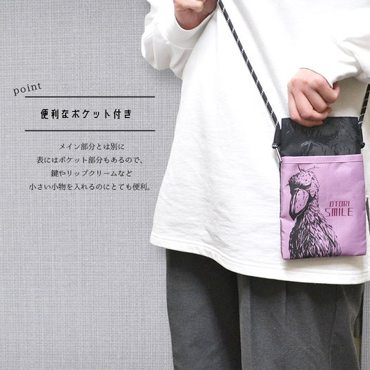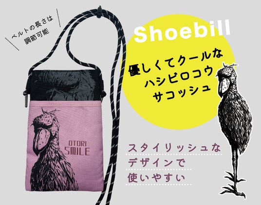 とびっきりご機嫌なハシビロコウが描かれたサコッシュ♪ショルダー部分は調節可能でご家族で一緒に使ったり、シーンや用途によって変えることが出来てとっても便利。「kotori smile」の"kotori"(小鳥)が"Otori"(大鳥)になったロゴもポイント♪