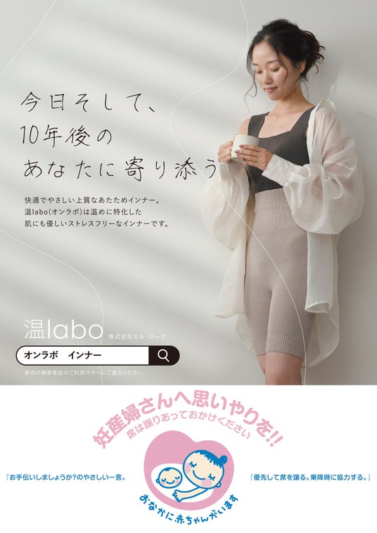 株式会社エル・ローズ(本社:福井県福井市)が運営する上質あたためインナーブランド「温labo(オンラボ)」は、厚生労働省が推進する妊産婦さんの優しい環境づくりをサポートする「マタニティマーク」の普及活動に賛同し、2023年12月から1年間、都営地下鉄大江戸線の優先席エリアにタイアップ広告を掲出いたします。