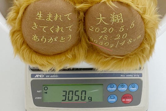 その異なる重さ(体重)を1g単位で再現し、ご希望で、お名前・生年月日、メッセージなどを刺繍することで、長く愛していただける世界で一つだけの宝物になります。