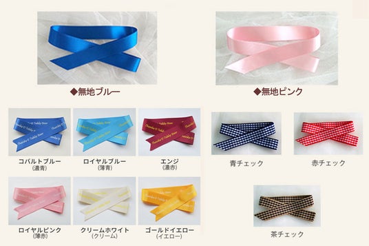 ご新郎ベアには「無地ブルーリボン」、ご新婦ベアには「無地ピンクリボン」が標準装備。高級サテン生地の艶やかなリボンです。お好みで他9種のリボンからチョイスすることも可能。(別料金)