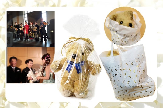 クリアラッピングは高級感を高め、特別な日の演出をさらに華やかに。晴れの日の装いにテディベアの毛が付着することも防ぎます。手提げ袋は、ちょっとした気遣いに喜ばれ、式後もご両親様にスマートに持ち運びいただけます。