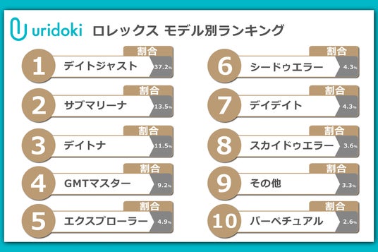 ロレックスのなかではデイトジャスト(37.2%)がもっとも多く、次点でサブマリーナ(13.5%)、デイトナ(11.5%)、GMTマスター(9.2%)、エクスプローラー(4.9%)の順で買取依頼が多い結果となりました。