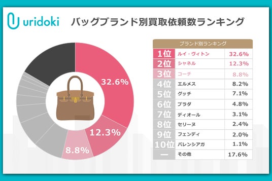 最も買取依頼がされたブランドバッグはルイ・ヴィトンで、全体のうち32.6%と約1/3を占めています。その他バッグの世界三大ブランドであるシャネルは12.3%で2位、エルメスは8.2%で4位と、この三大ブランドで全体の53.1%を占める結果になりました。