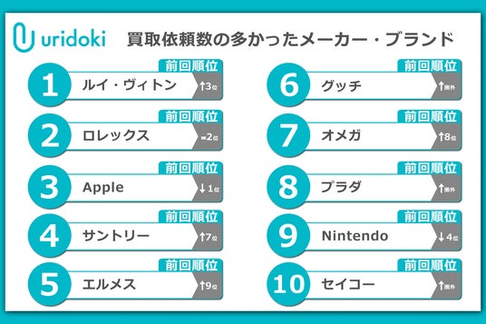 全体を通しての買取依頼数が多かったメーカー・ブランドは、バッグの買取依頼が多いことから、ルイ・ヴィトンが1位となった。次いで2位は高級時計のロレックス。3位のAppleはiPhoneやMacBookの買取依頼が多いことからランクインしました。