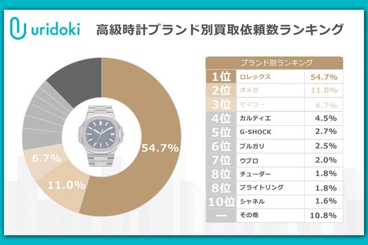 買取依頼数がもっとも多かった時計ブランドはロレックスで全体のうち54.7%。次いで2位のオメガが11%でした。