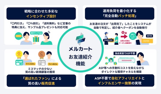 株式会社メルカート(本社:東京都港区、代表取締役社長:渡邉 章公/以下、メルカート)は、提供するクラウドEC構築プラットフォーム「メルカート」において、新機能「お友達紹介機能」の提供を開始します。本機能により、メルカートをご利用の事業者はファンが新たなファンを呼ぶ循環型マーケティングを展開でき、新規顧客の獲得効率を劇的に高めることが可能になります。また、紹介者と被紹介者の双方へ最適なインセンティブを提供することで、ブランドへの愛着を深め、再来訪の促進によるLTV(顧客生涯価値)の向上を同時に実現。限られたリソースで売上最大化を目指す、EC事業者の持続的なビジネス成長を強力にバックアップいたします。EC市場の競争激化に伴い、Web広告費の高騰によるCPA(顧客獲得単価)の上昇は、EC事業者共通の課題となっており、広告施策に加えて複数の集客チャネルを持つことの重要性が高まっています。