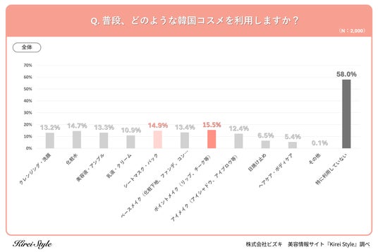 最も利用率が高かったのは「ポイントメイク」で15.5%、次いで「シートマスク・パック」が14.9%という結果になりました。韓国コスメには粉質が良く肌なじみの良いアイシャドウ、発色の良いリップなどの「映え」重視のポイントメイクコスメが多く、その人気の高さがアンケート結果からも観察できます。