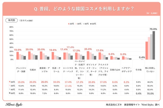 年代別に見ると、20代の利用率の高さが際立ちます。「ポイントメイク」が20.8%、「化粧水」と「美容液」が共に20.0%と、スキンケアからメイクまで幅広く韓国コスメを愛用している「韓国コスメネイティブ」な姿が浮かび上がります。年代と韓国コスメの利用率は反比例の関係にあり、20代は半数以上がなんらかの韓国コスメを利用している一方、50代の利用率は30%にまで低下するという結果になりました。
