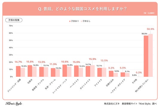 子供の有無で見てみると、全体を通して「子供なし」の層よりも「子供あり」の層の方が韓国コスメの利用率が高い傾向があることが分かりました。リーズナブルな価格で質の良い商品を購入することができる韓国コスメは、家計のやりくりを担うママたちのお財布の味方になっているのかもしれません。
