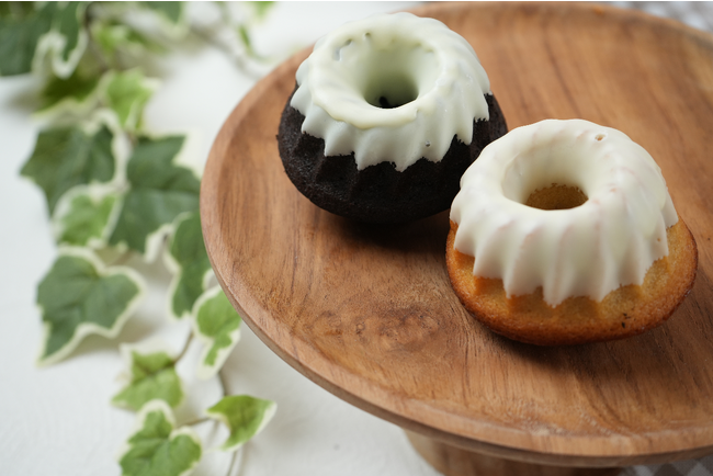 「クグロフ 2種 」シフォンケーキを小さくしたようなかわいらしい形状が特徴です。しっとりとした生地に程よい甘味の食べ応えのあるスイーツです。プレーンとチョコの2種類をご用意しています。