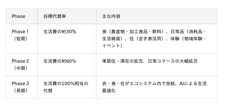 (3)段階的な実装設計本構想は以下の3段階で実装を進め、中長期的には生活費100%相当の代替を目指します。