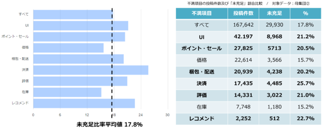 母集団2.を対象に、不満項目別の投稿件数と「未充足」割合を比較した。l投稿件数は「UI」「ポイント・セール」「価格」が上位となった。「未充足」の割合は、「UI」「ポイント・セール」「梱包・配送」「決済」「評価」「レコメンド」が全体平均を上回った。