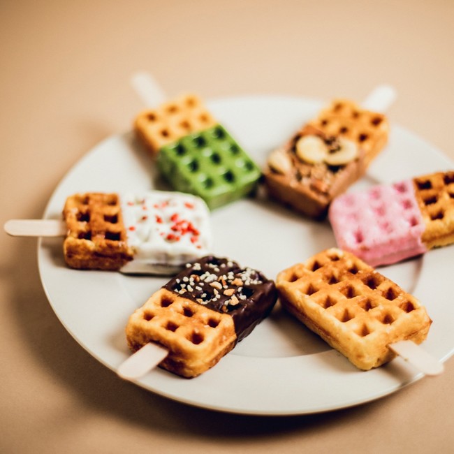 【レベル2】ワッフルをアレンジして撮影京ワッフルに生クリームやアイスをトッピングしたものを小さめのお皿に乗せ、真上から撮影。