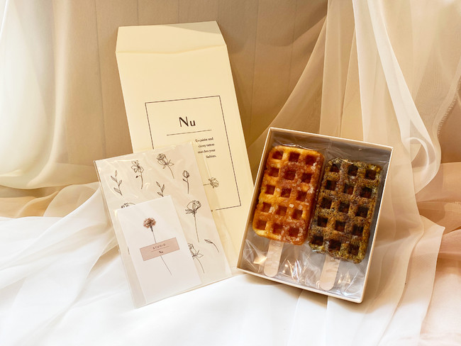 商品特長kyocafe chacha三条店のイートインでも絶大な人気を誇る「クラシック京ワッフル」と「アールグレイ京ワッフル」を1本ずつ(合計2本)と、Nu. studio 人気No.1商品「Blooming」をセットで販売いたします。