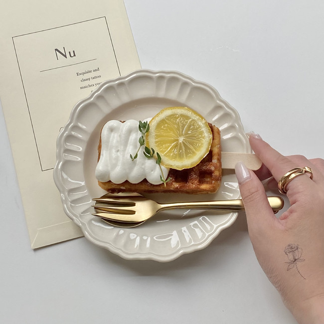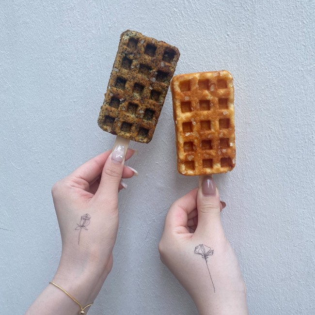 ワッフルを可愛くアレンジするだけでなく、お持ちのアクセサリーに加え、指や手の甲などにタトゥーシールを貼ることで、さらに魅力的な雰囲気を醸し出します。