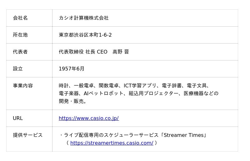 ライブ配信専用のスケジューラーサービス「Streamer Times」( https://streamertimes.casio.com/ )カシオの配信スケジューラー「Streamer Times」は、17LIVE、TikTok LIVE、YouTube LIVEなど複数のライブ配信プラットフォームを一元管理でき、配信予定をファンに通知する機能を備えています。