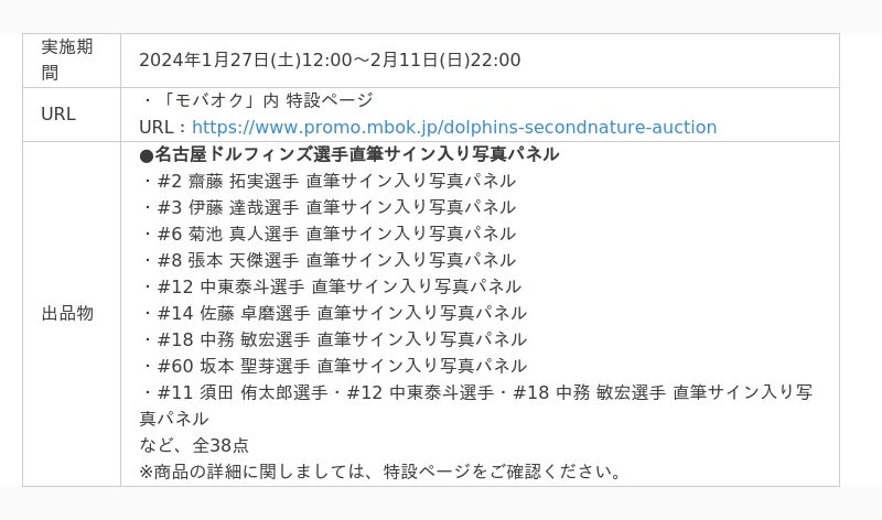株式会社モバオク 株式会社モバオク(本社:東京都渋谷区、代表取締役社長:生田目 知之、以下モバオク)が運営するオークションサービス「モバオク」にて、名古屋ダイヤモンドドルフィンズのオフィシャルフォトグラファー、柴田祐希氏(以下、柴田氏)が実施する「Second Nature 写真パネル チャリティーオークション」を2024年1月27日(土)から2月11日(日)まで開催します。