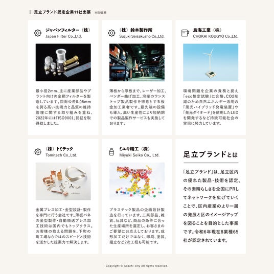 区内企業の優れた製品・技術を足立区が認定し、その素晴らしさを全国に発信することで、区内産業のより一層の発展と足立区のイメージアップを図ることを目的とした「足立ブランド」事業は、平成19年度に11社からスタート、17年目を迎えた令和6年1月現在、ブランド企業認定数は8業種65社まで拡大しています。
