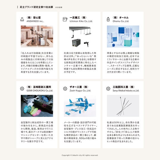 8業種全65社を網羅した「足立ブランド認定企業紹介冊子」も最新版を会場で配布しておりますので、東京近郊で皮革・樹脂・生活関連・工芸・乗物・印刷・金属・機械器具の頼れるパートナーをお探しの皆様は、ぜひ「足立ブランド」ブースへお越しください。