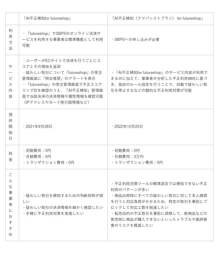 株式会社フューチャーショップ(以下「フューチャーショップ」)とソフトバンク株式会社の子会社であるSBペイメントサービス株式会社(以下「SBPS」)は、フューチャーショップが提供するSaaS型ECサイト構築プラットフォーム「futureshop」および「futureshop omni-channel」(以下、総称として「futureshop」)で、クレジットカード決済の不正利用を検知する有料サービス「AI不正検知(アドバンストプラン) for futureshop」を、2022年10月20日に提供開始しました※1。