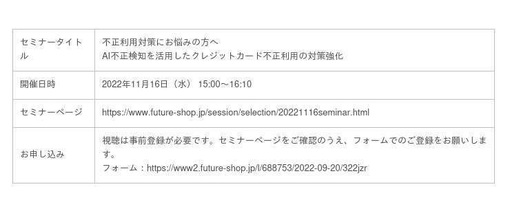 https://www.future-shop.jp/plan/sbps.htmlまた、今回の提供開始を受け、2022年11月16日に「AI不正検知(アドバンストプラン) for futureshop」のセミナーを開催します。