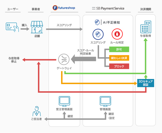 「AI不正検知for futureshop」と同様に、ユーザーがECサイトで決済を行うごとにSBPSへスコアリングをリクエストし、SBPSは、スコアとその理由を返却し、疑わしい取引については「futureshop」の受注管理画面にアラートを表示します。