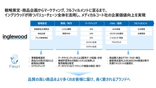 メディカルコート社は国際ライセンスを持つエステティシャンと共同開発した「Fleuri(フルリ)」をはじめ、流行の変化が激しいスキンケア領域において、その高い商品力によって長くお客様に愛されるブランドを創り上げてきました。メディカルコート社の商品力やブランド運営力に、当社が自社ブランド運営やマーケティング・コンサルティング支援事業で培った、商品販売におけるあらゆるマーケティングソリューションを掛け合わせることで、より多くのお客様に手に取っていただけるブランドへと、共に成長できることを楽しみにしております。