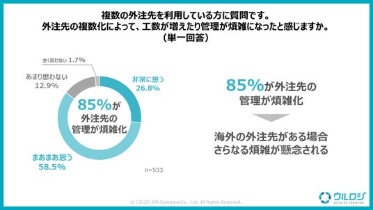 さらに、「複数の外注先を利用している方に、外注先の複数化によって工数が増えたり管理が煩雑になったと感じますか。」と聞いたところ、「複数の外注先を利用している事業者の85%が、外注先の管理が煩雑になったと感じています。