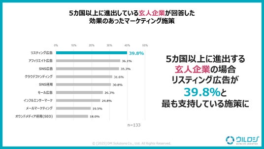 次に5カ国以上に進出している玄人企業では、リスティング広告(39.8%)が最も効果があったと回答しています。複数国に進出している企業がリスティング広告を重視しているのは、広範囲なターゲットに効率的にリーチできるというメリットが改めて認識されているためと考えられます。