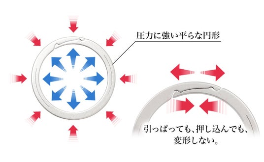 合わせ目の波形デザインは圧力を放射状に分散します。この為、横方向からの圧力に強く、簡単に変形しません。付け外しの時のみ縦に開くため、脱落する事なくしっかりとホールドします。